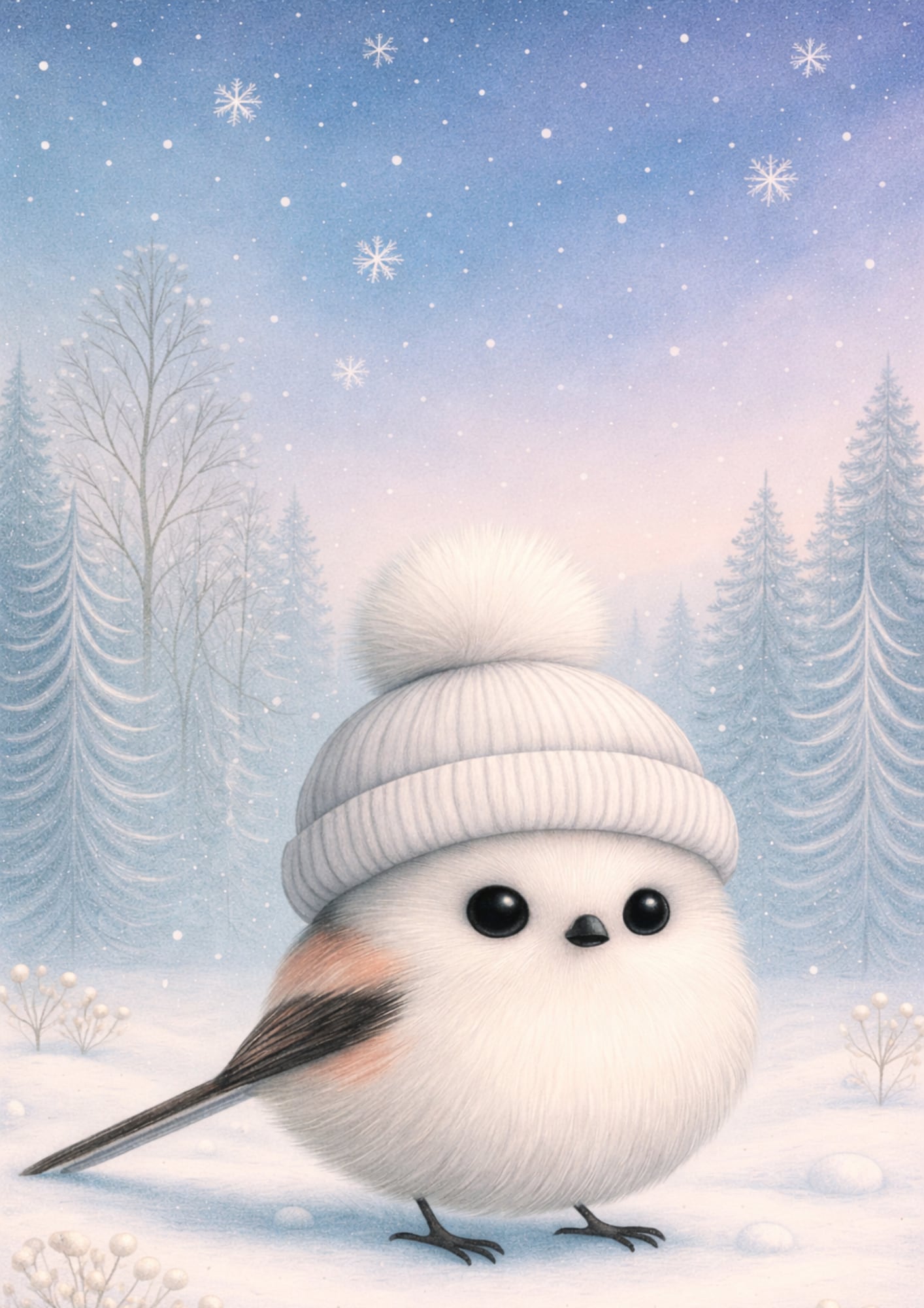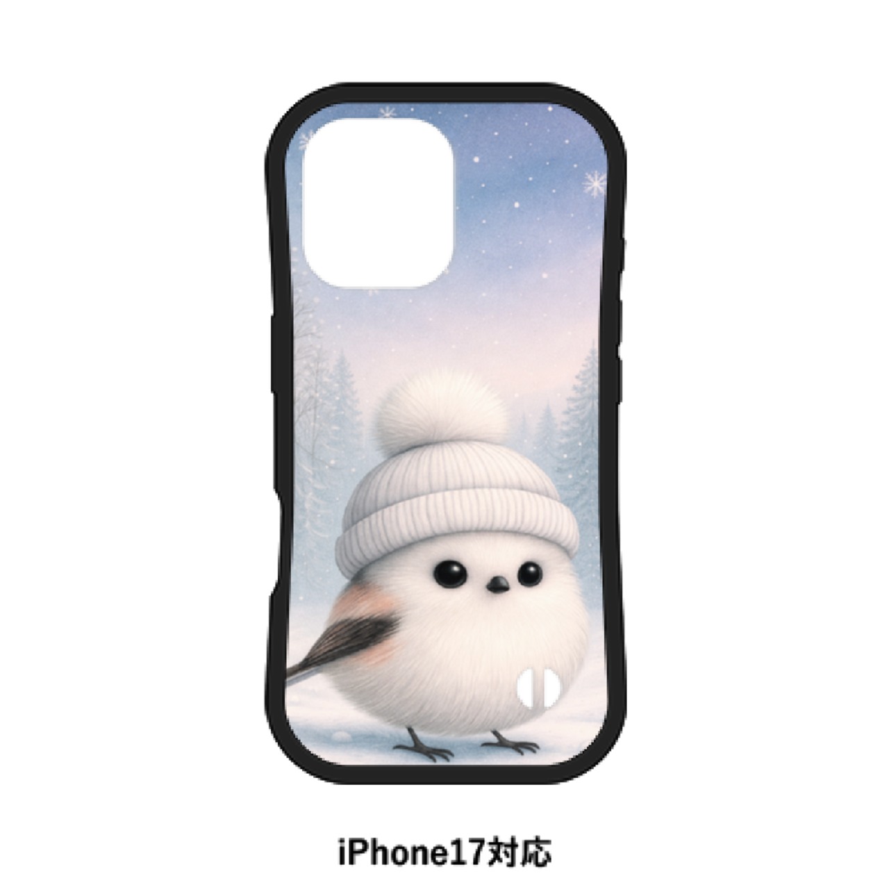 白い帽子をかぶったシマエナガをデザインした、可愛らしさと実用性を兼ね備えたiPhone17専用スマホケースです。